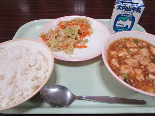 今日の献立は「マーボーどうふ」「ちゅうかふうごまだれサラダ」「むぎめし」「ぎゅうにゅう」です。