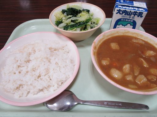 今日の献立は「カレーライス」「アレッタのサラダ」「ぎゅうにゅう」です。今日は、みえ地物一番給食です。