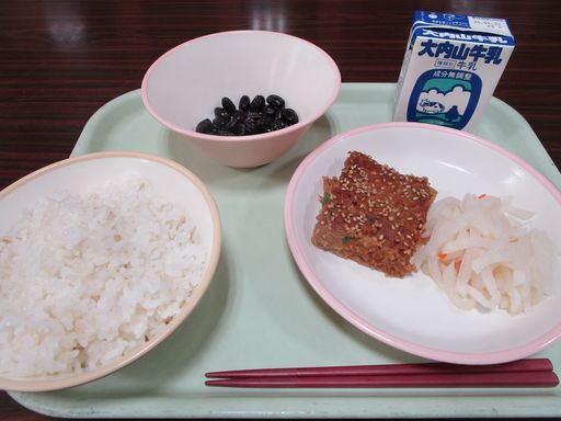 お正月にちなんだ献立です。松風焼きや黒豆、紅白なますは、おせち料理です。それぞれ願いがこめられています。