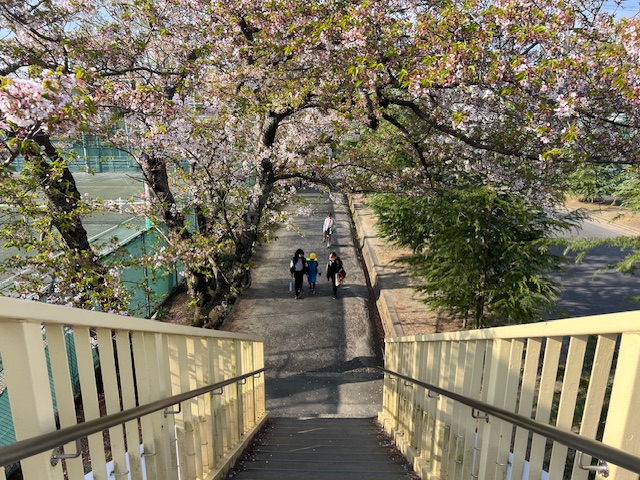 朝、登校指導に向かう歩道橋から見下ろすとまるで、桜のトンネルのように見えます。もっと咲いているときに写真に撮れたらよかったのですが・・・桜のトンネルをくぐり、登校、すてきです!!