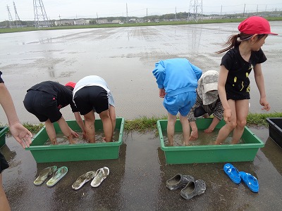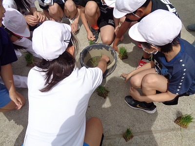 グループに分かれて、まずは、バケツの中で稲(2~5本)を植え付けさせていただきました。
