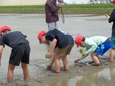 いよいよ、実際に田んぼの中へ。泥に足を取られながらも、上手に植えることができました。2~5本の苗で、バケツ1杯分のお米がとれるそうです。
