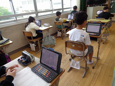 4・5年生は問題の大半をタブレットで解答、説明などを必要とする問題は解答用紙に記入する形式です。