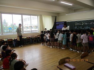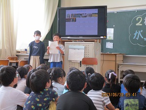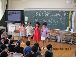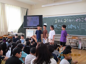 2年生は、生活科「1年生に学校を紹介しよう」の学習で、1年生を教室に招き、発表をしました。事前に、先生たちにインタビューをしたり、タブレットで特別教室などの写真を撮影したりして、準備のときから班の友だちと協力しながら取り組んできました。