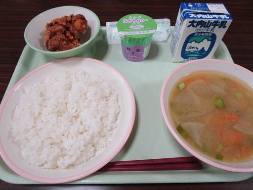 今日の献立は「とりにくのからあげ」「みそしる」「ぶどうゼリー」「あんとうまい」「ぎゅうにゅう」です。