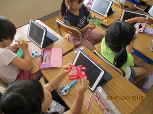 1年生は、七夕飾りの提灯づくりをしました。できたちょうちんを見て大喜びしていました。