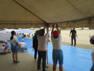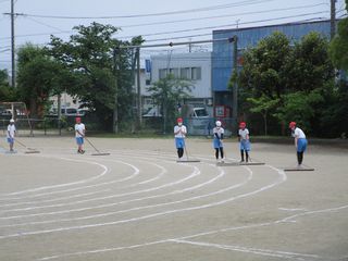 運動場をトンボで整地したり、ラインを引いたり、児童席に敷くシートを準備したり、テントを組み立てたり・・・