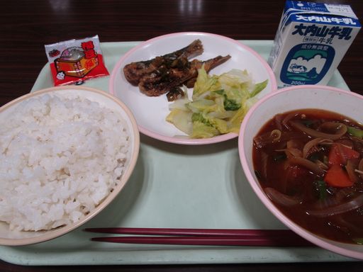 今日の献立は「いわしのなんばんづけ」「はくさいづけ」「あかだし」「せつぶんまめ」「むぎめし」「牛乳」です。