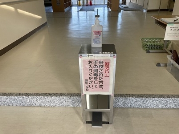 また、国体中止に伴い感染症対策で購入された物品の寄贈があり、足踏み式消毒スタンド、手指消毒液等をいただきました。来客用玄関に設置して活用しています。