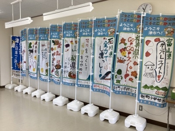 三重とこわか国体・大会が中止になって、昨年度、今の6年生が頑張って描いた応援旗が戻ってきました。国体選手の皆さんに見てもらえなくて残念でしたが、本校2階のギャラリーに飾って、全校の子どもたちに披露しています。