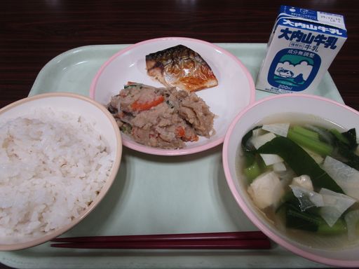 今日の献立は「さばのしおやき」「あからのいりに」「ゆばのすましじる」「むぎめし」「ぎゅうにゅう」です。
