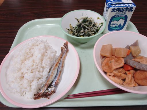 今日の献立は「やきししゃも」「ひとくちおでん」「ほうれんそうのいそかあえ」「むぎめし」「ぎゅうにゅう」です。