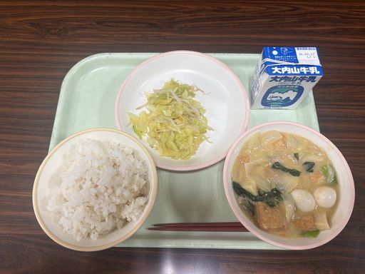 今日の献立は「あつあげとうずらたまごのちゅうかに」「ちゅうかあえ」「むぎめし」「牛乳」です。