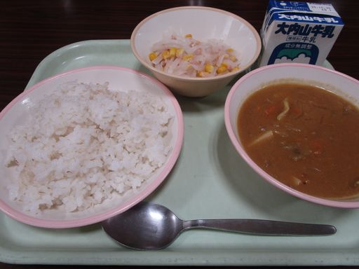 今日の献立は「きのこカレーライス」「だいこんサラダ」「むぎめし」「ぎゅうにゅう」です。