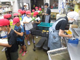 バックヤードでは、野菜やフルーツ等をパック詰めしたり、魚やお肉を調理したりする様子を見学しました。