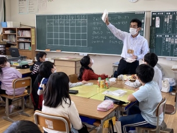 今日の3・4限目、三重県環境学習センターの方に来ていただき、4年生を対象に出前授業をしていただきました。実際に買い物を体験することで、過剰な包装があることに改めて気づき、できるだけゴミを減らすために、次に買い物をした際には、ばら売りコーナーで買い物をしたり、ペットボトルより紙パックを選んだりする姿が見られました。最後には、給食時間の放送でも「食品ロスをなくそう」と全校に呼び掛けてもらいました。