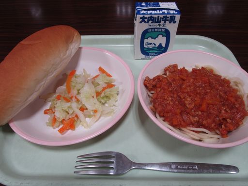 今日の献立は「スパゲッティミートソース」「ドレッシングサラダ」「パン」「ぎゅうにゅう」です。
