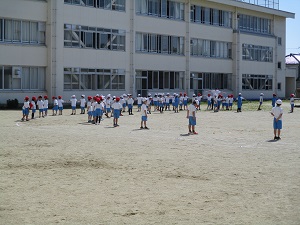1.2年生がダンスの練習を行いました。運動場での自分の立ち位置の確認などを行った後、曲を流して踊っていました。楽しそうに踊る姿が、とてもかわいかったです。
