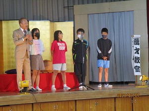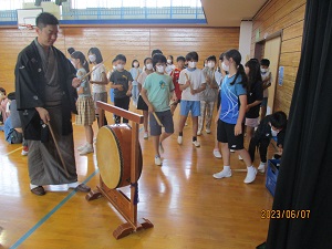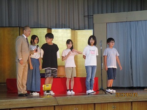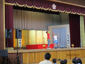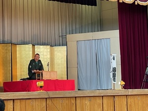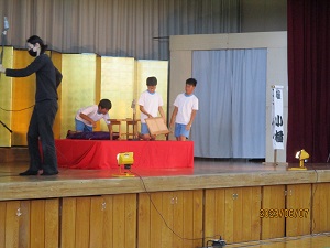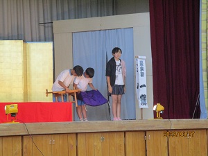 学校創立150周年事業のひとつとして、3、4時間目に、関西演芸協会の方々による「谷川士清寄席」公演が体育館にて実施されました。 創作漫才、アイウエオ作文、お茶子さん、一番太鼓に6年生の児童が出演しました。みんな緊張しながらもしっかり演技、手伝いをしていました。