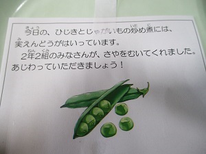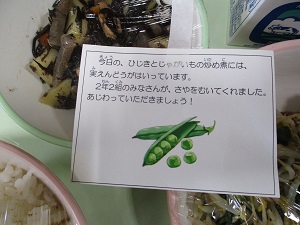 年生がさやむきをしてくれた実えんどうが入っていました。いつも以上においしく味わうことができました。ありがとう。