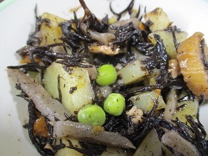 今日の給食メニューに、「ひじきとジャガイモの炒め煮」がありました。その中には、昨日