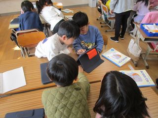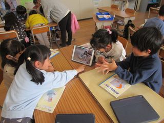 1年生が生活科で、家でのお手伝いを紹介し合っていました。