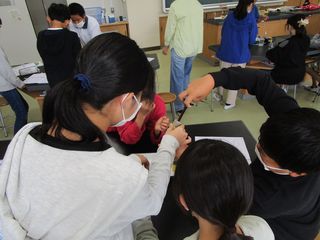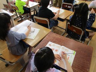 書きやすい鉛筆の持ち方や姿勢を確かめたり、カタカナの「おれ」と「まがり」を確かめたりしていました。