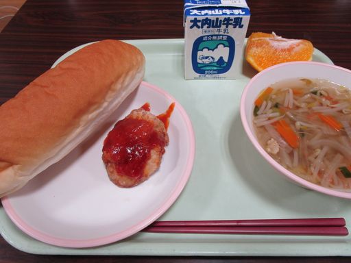 今日の献立は「ヤンニョムチキン」「はるさめスープ」「デコポン」「パン」「ぎゅうにゅう」です。
