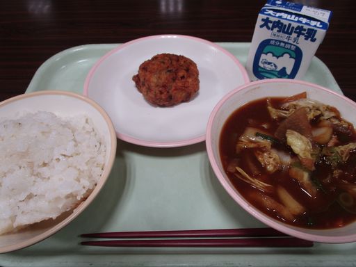 今日の献立は「まさごあげ」「ぶたじる」「むぎめし」「ぎゅうにゅう」です。