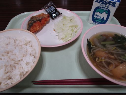 今日の献立は「さけフライ」「そえキャベツ」「ごもくじる」「むぎめし」「ぎゅうにゅう」です。