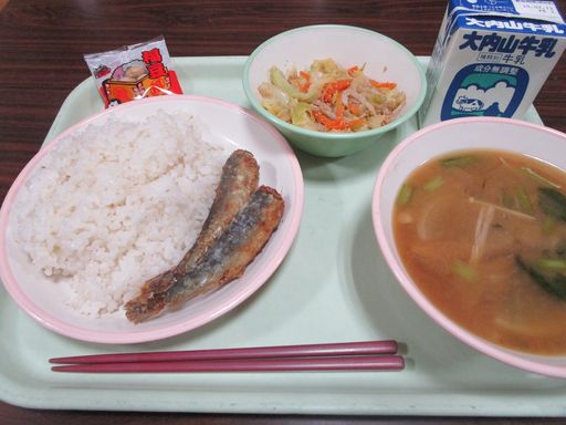 今日の献立は「いわしのからあげ」「だいこんのみそしる」「ごまだれあえ」「せつぶんまめ」「むぎめし」「ぎゅうにゅう」です。