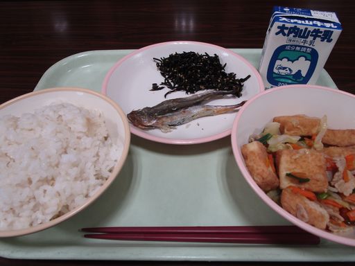 今日の献立は「やきししゃも」「やさいのいためもの」「ひじきふりかけ」「むぎめし」「ぎゅうにゅう」です。