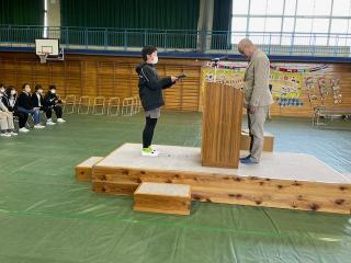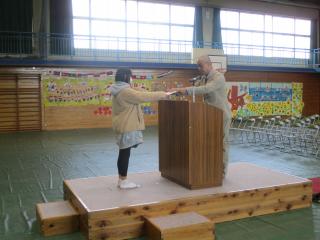 6年生が、タブレットの返還式、小中書写展の表彰を行いました。6年生は、3年間タブレットを使い学習をしてきました。6年生から返還されたタブレットは、来年度入学する1年生に貸与します。中学校でも、使用のルールを守りながら、有効な使い方をし、学びの定着や深まりに活かしてほしいと思います。