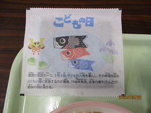 手巻きのりの袋には、こどもの日とは、「こどもたちの人格を重んじ、幸福をはかるとともに、お母さんにも感謝する日」です(祝日法より)。と書いてありました。端午の節句は男の子の節句と言われますが、こどもの日には、もちろん男女の区別はありません。お母さんに限らず、お父さんに感謝してもいいですよね。