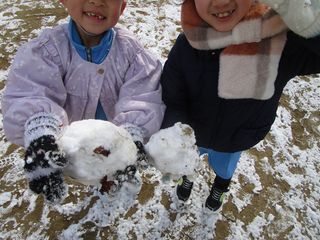 登校してくる子どもたちの中には手に雪玉を持っている子もいます。