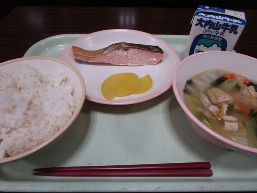 今日の献立は「さけのしおやき」「すいとん」「たくあんづけ」「むぎめし」「ぎゅうにゅう」です。