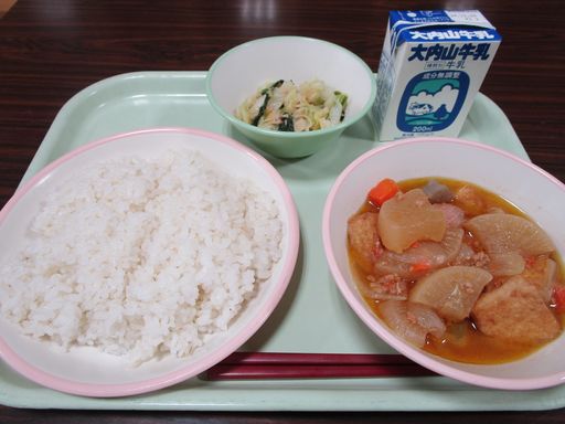 今日の献立は「あつあげとやさいのそぼろに」「こまつなとツナのあえもの」「むぎめし」「ぎゅうにゅう」です。
