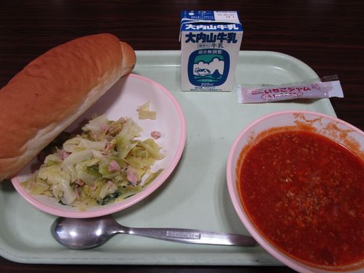 今日の献立は「チリコンカーン」「ツナサラダ」「いちごジャム」「パン」「ぎゅうにゅう」です。