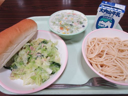 今日の献立は「あおさのクリームスパゲッティ」「こまつなのサラダ」「げんりょうパン」「ぎゅうにゅう」です。
