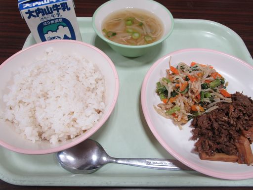 今日の献立は「かわりビビンバ」「ワンタンスープ」「ぎゅうにゅう」です。