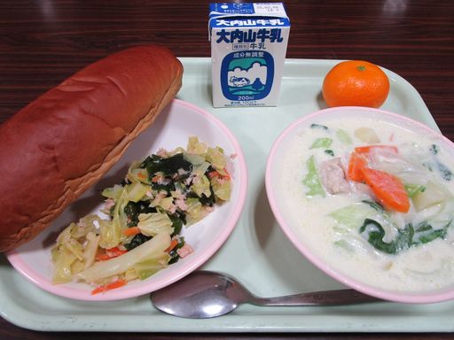 今日の献立は「チンゲンサイのクリームに」「わかめサラダ」「みかん」「こくとうパン」「ぎゅうにゅう」です。