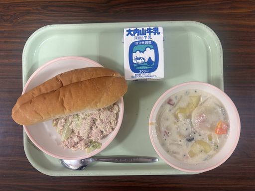 今日の献立は「セルフツナサンド」「きのこととうにゅうのチャウダー」「ぎゅうにゅう」です。