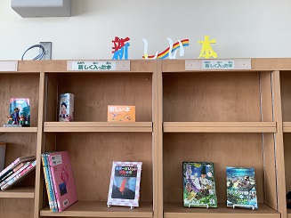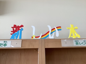 図書室に新しく本が入り、子どもたちもたくさん図書の本を借りに来るようになりました。新しい本のコーナーには、西橋内中学校のスクールサポートスタッフの方が制作していただいた手作りロゴも飾られています。