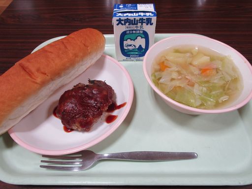 今日の献立は「おからいりハンバーグ」「やさいスープ」「こめこいりパン」「ぎゅうにゅう」です。