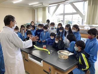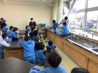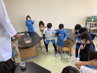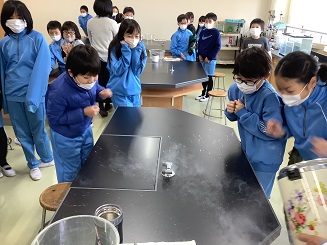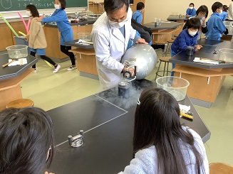 今日、4年生を対象に三重県生涯学習センター主催の文化体験プログラム事業があり、「液体窒素で遊ぼう!」というサイエンス実験を行いました。空気には重さがあることや、液体窒素を使って液体から気体になることの不思議さを、たくさんの実験を通して学ぶことができました。ゴムボールが陶器のように割れたり、カチカチに凍った豆腐やコンニャクが粉々に砕かれたりする実験には、子どもたちから驚きの歓声が何度も起こりました。