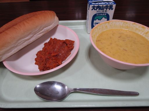 今日の献立は「スロッピージョーサンド」「かぼちゃのポタージュ」「ぎゅうにゅう」です。