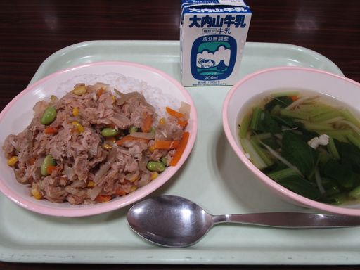 今日の献立は「ツナそぼろごはん」「あおなのスープ」「ぎゅうにゅう」です。