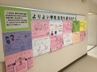 今、2階の掲示板には、5年生が各グループで考えたアイデアシートが掲示してあります。国語科で学習・発表したもので「みんなが元気に挨拶をするには?」「給食の残飯を減らすには?」「トイレのスリッパをいつもキレイにするには?」など、身近なことから課題を見つけ、課題解決に向けた取り組みをいろいろと考えてくれました。この中から一つでも解決できれば嬉しいですね。