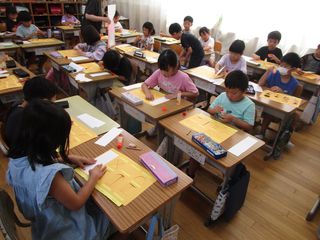 1年生が図工「わたしのおべんとう」で、どんなお弁当を作るか考えていました。
