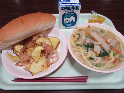 今日の献立は「しろごまタンタンめん」「さつまいもとれんこんのチップス」「みかんジャム」「パン」「ぎゅうにゅう」です。